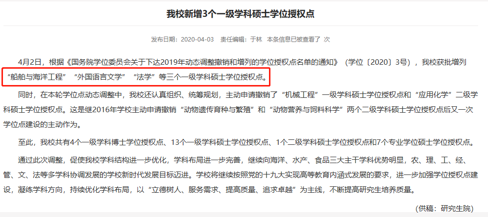 文中提到:上海海洋大學(xué)獲批增列“船舶與海洋工程”、“外國(guó)語言文學(xué)”、“法學(xué)”等三個(gè)一級(jí)學(xué)科碩士學(xué)位授權(quán)點(diǎn)。