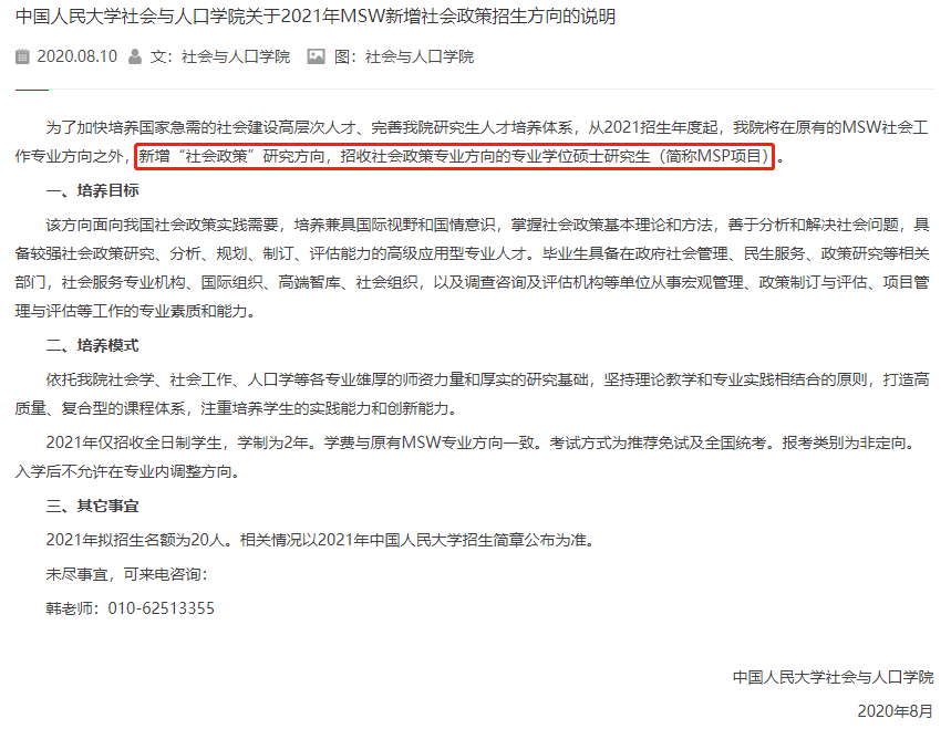 2020年8月10日,中國(guó)人民大學(xué)社會(huì)與人口學(xué)院發(fā)布《中國(guó)人民大學(xué)社會(huì)與人口學(xué)院關(guān)于2021年MSW新增社會(huì)政策招生方向的說明》。