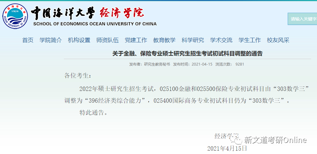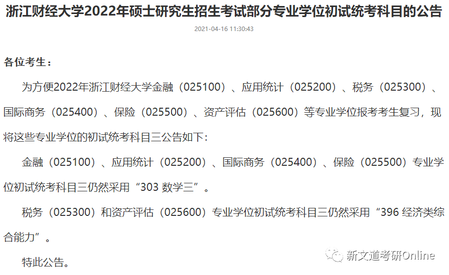 山東財經大學研招辦官方微博發布預告稱,金融、稅務、保險、國際商務、資產評估五個專碩初試科目業務課一將由303數學三調整為396經濟類綜合能力。