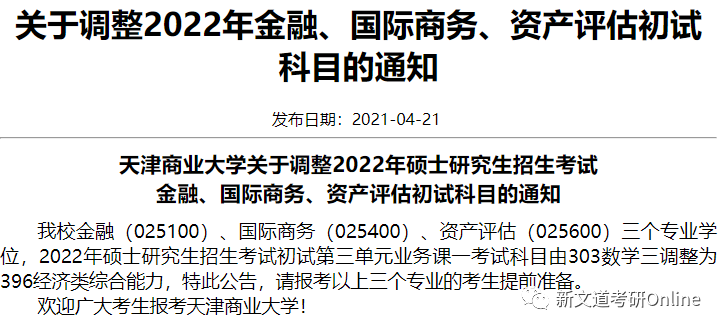 金融和保險專碩初試科目由“303數學三”調整為“396經濟類綜合能力”,國際商務專碩初試科目仍為“303數學三”。
