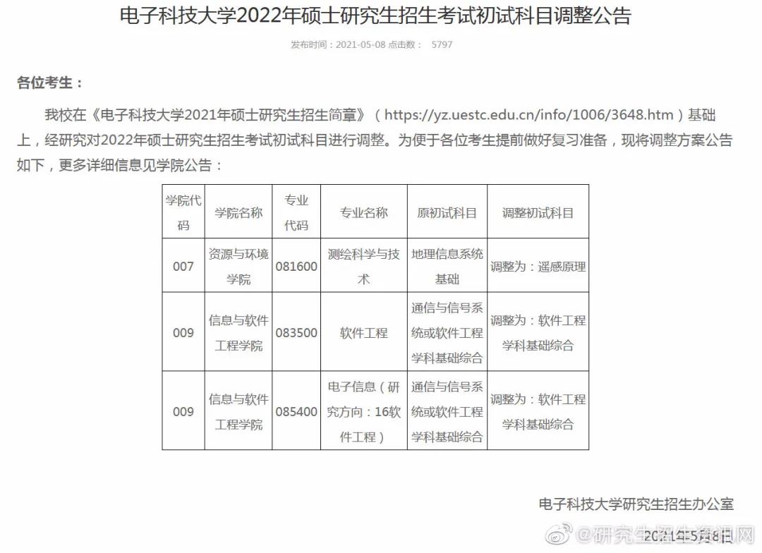 電子科技大學2022年碩士研究生招生考試初試科目調整公告。