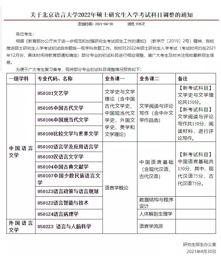 北京語言大學推進碩士研究生入學考試初試自命題按一級學科命題工作,部分專業初試科目調整情況預告如下: