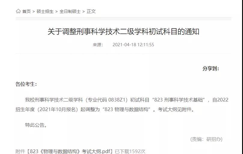 0838Z1刑事科學技術的初試科目"823刑事科學技術基礎",自22考研起調整為"823物理與數據結構"。