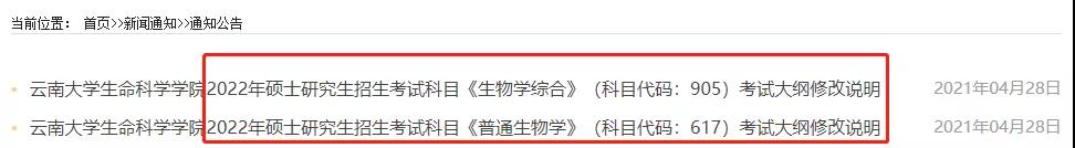 云南大學生命科學學院關于初試科目《生物學綜合》、《普通生物學》考試大綱做了修改說明: