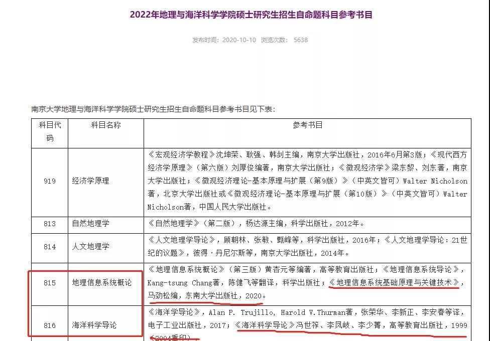 南京大學地理與海洋科學學院關于初試科目《地理信息系統概論》和《海洋科學導論》的參考書目各添加了一本: