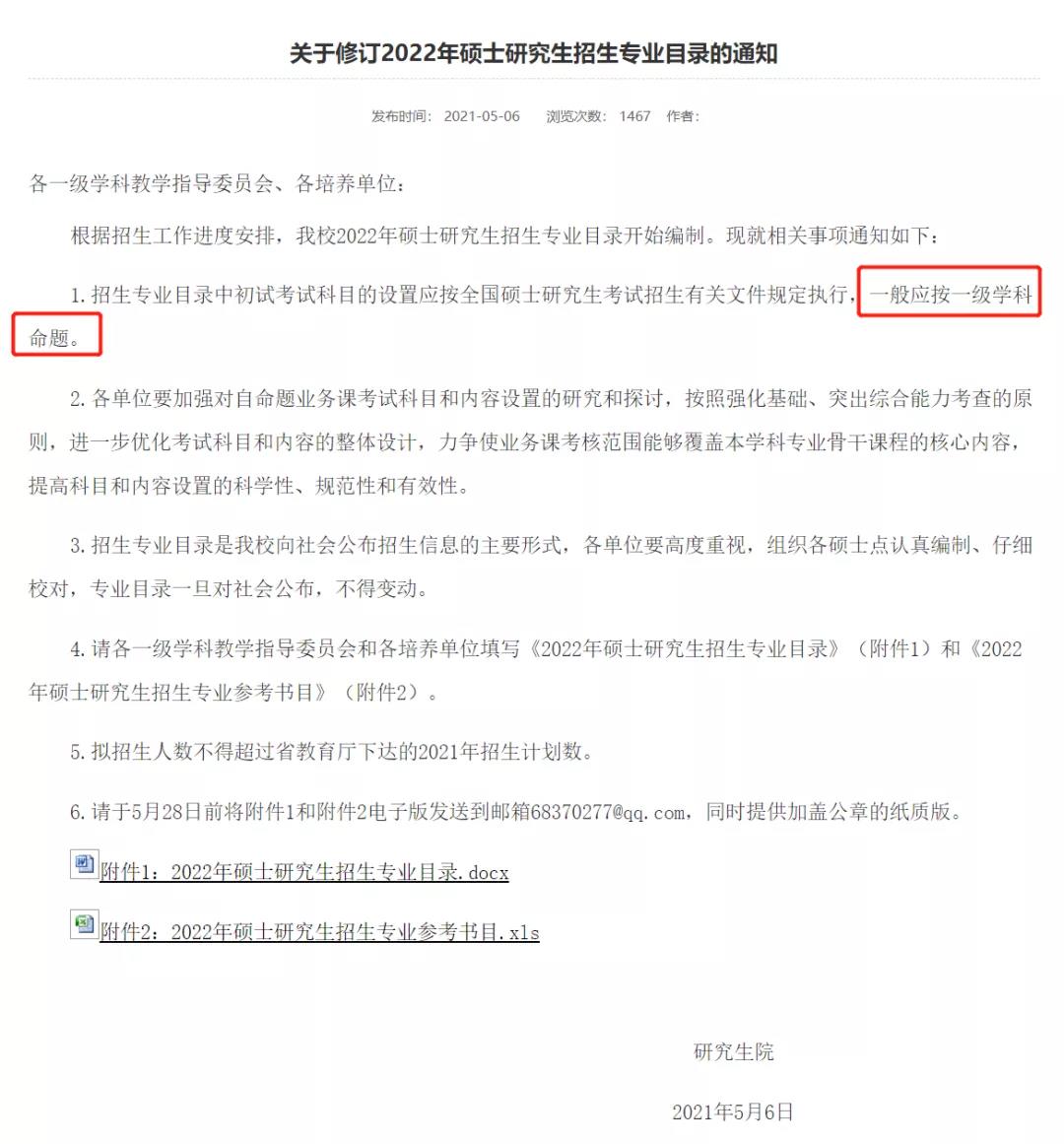 發布2022年碩士研究生招生專業目錄修訂的通知,強調初試考試科目一般應按一級學科命題。報考該校的同學可關注學校官網的后續通知。