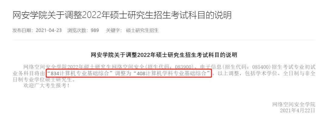 華中科技大學網絡安全學院招生專業為083900網絡空間安全、085400電子信息的初試科目"834計算機專業基礎綜合"調整為"408計算機學科專業基礎綜合"。