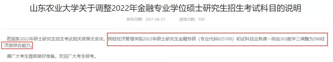 山東農業大學-經濟管理學院招生專業為025100金融專碩的初試科目"303數學三"調整為"396經濟類綜合實力"。