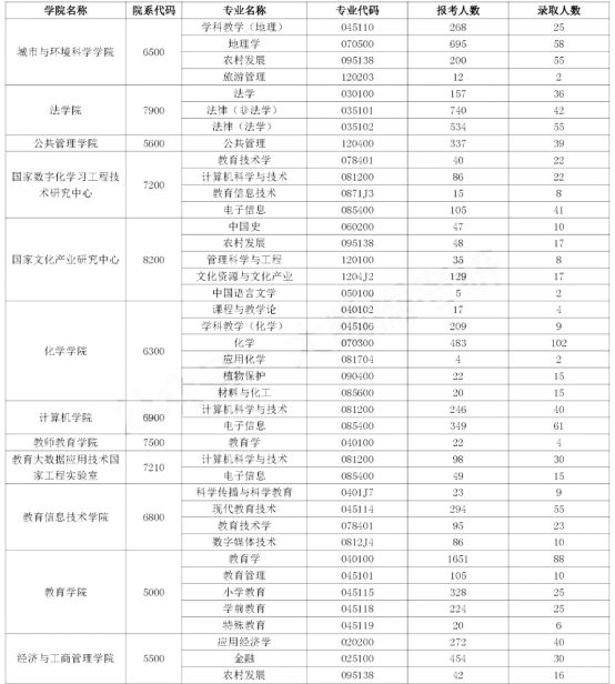 教育部直屬六所師范大學之一,考研熱度比較高,湖北、河南等地很多考生報考華師,其中熱門專業如心理學,教育學,學科教學等專業競爭非常激烈,報錄比高達36:1,不過該校分數線算是6所師范里較低的。