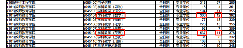 2020年學科教學(數學)報考366人,統考錄取12人,報錄比為30:1;學科教學(英語)報考537人,統考錄取11人,報錄比為49:1。