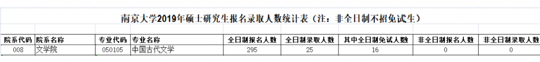 南京大學2019年中國古代文學報考295人,統考錄取5人,報錄比33:1。