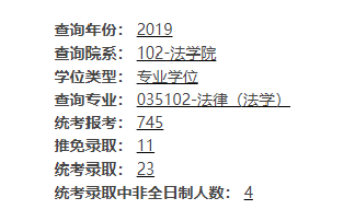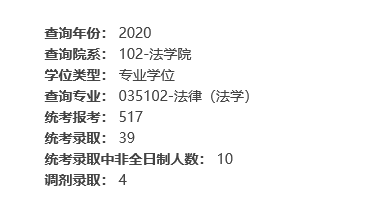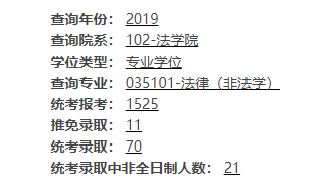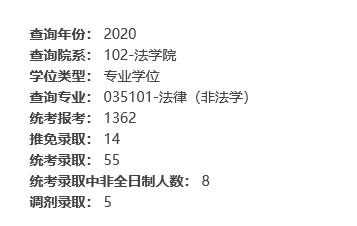 法律(非法學)專業2019年報考1525人,統考錄取49人,報錄比31:1;2020年報考1362人,統考錄取47人,報錄比29:1。