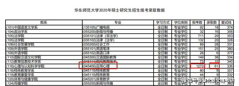 華東師范大學2020年應用心理學報考1273人,位居各專業報考人數第一,統考錄取61人,報錄比21:1。