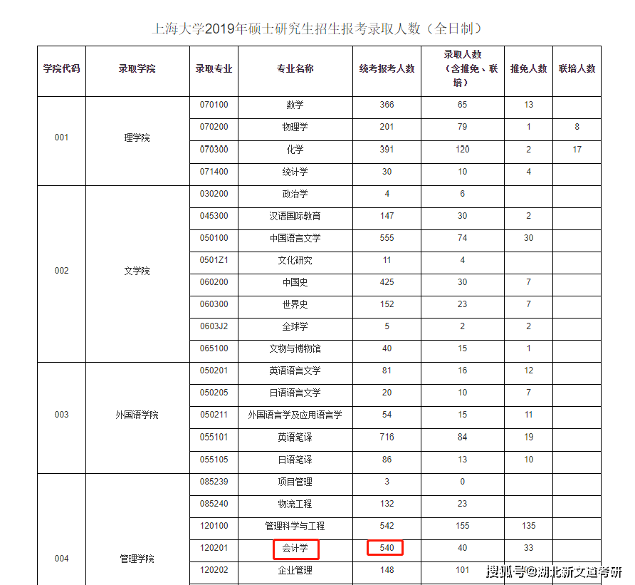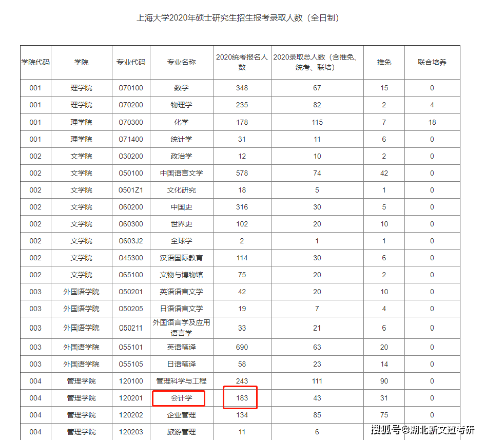 上海大學2019年會計學報考540人,統考錄取7人,報錄比高達77:1;2020年報考183人,統考錄取12人,報錄比15:1。